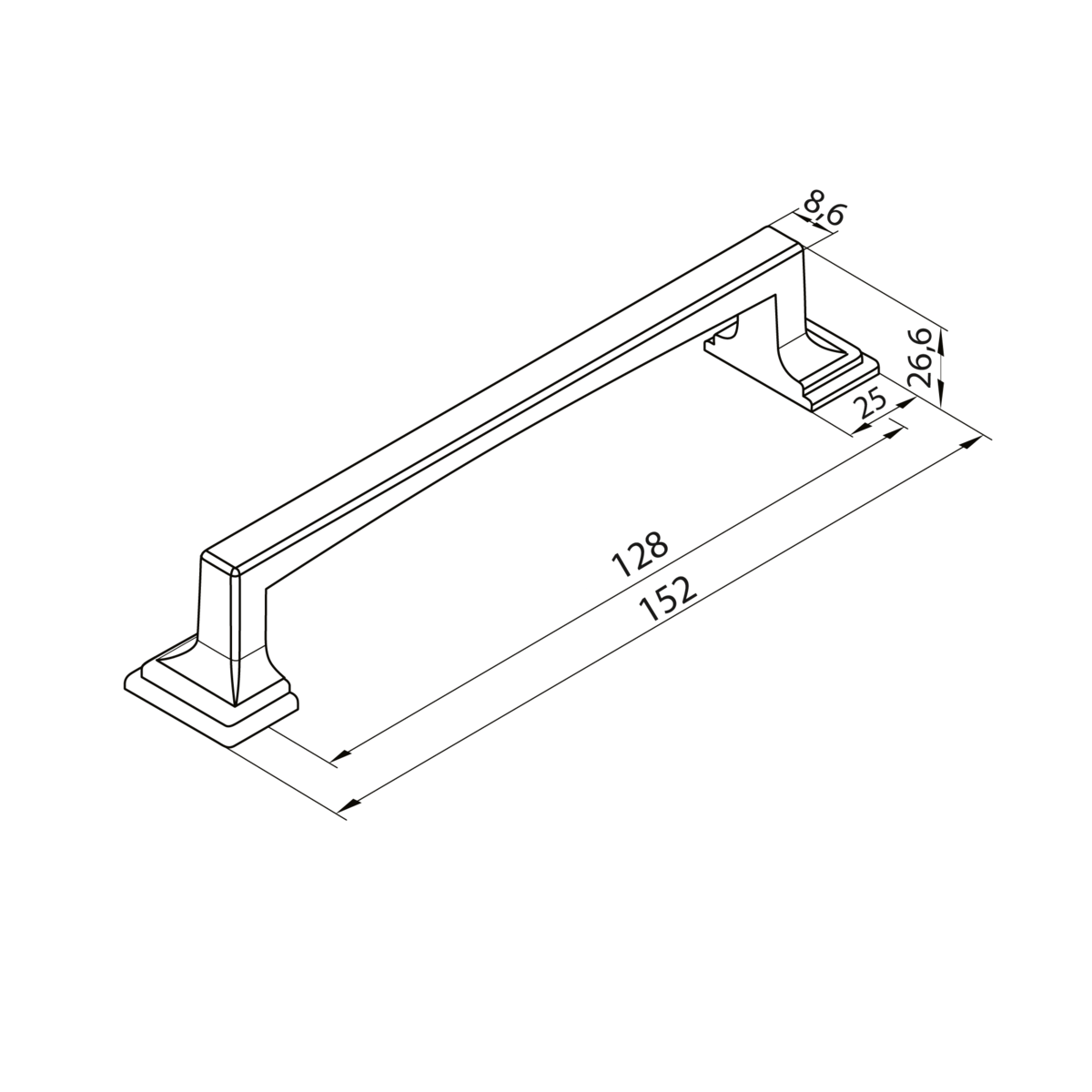 Форма ручки продумана до мелочей: тонкий прямоугольный профиль обеспечивает удобный захват, а устойчивые опоры с архитектурными акцентами придают ей визуальную основательность. Благодаря универсальному межцентровому расстоянию 128 мм, ручка подходит для фасадов ванных комнат, комодов, гардеробных и шкафов в классических и неоклассических интерьерах.