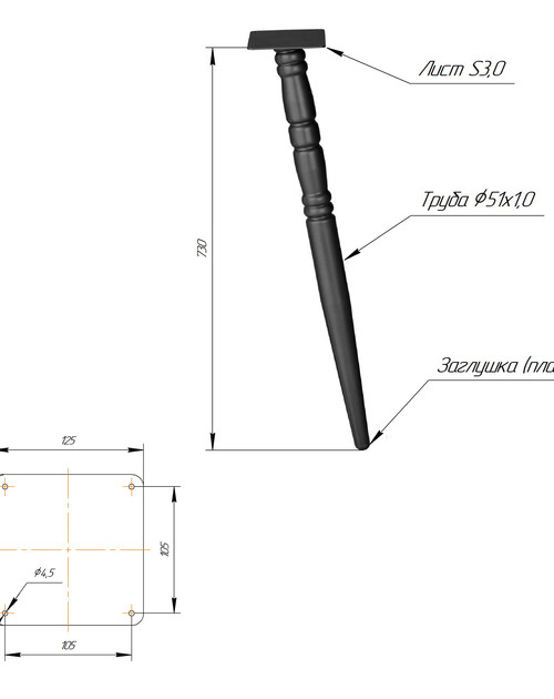 Изящные ножки соединены металлическими прутьями, которые вносят в образ утонченность и обеспечивают его прочность.Металлическая труба, диаметром/толщиной 20х1,5 мм. и пруток, диаметром 5 мм.