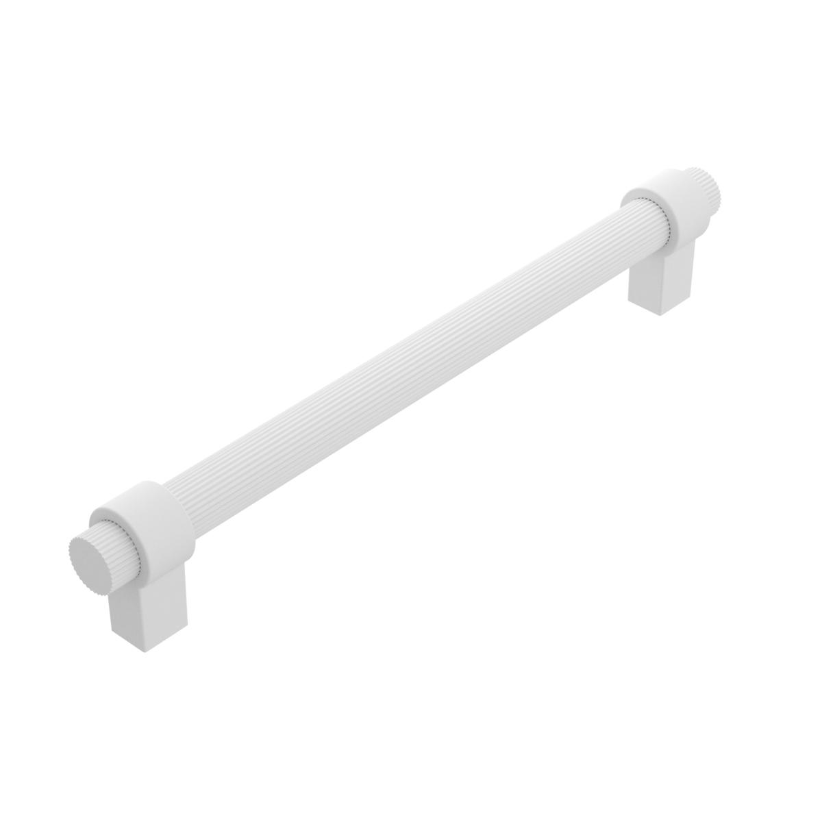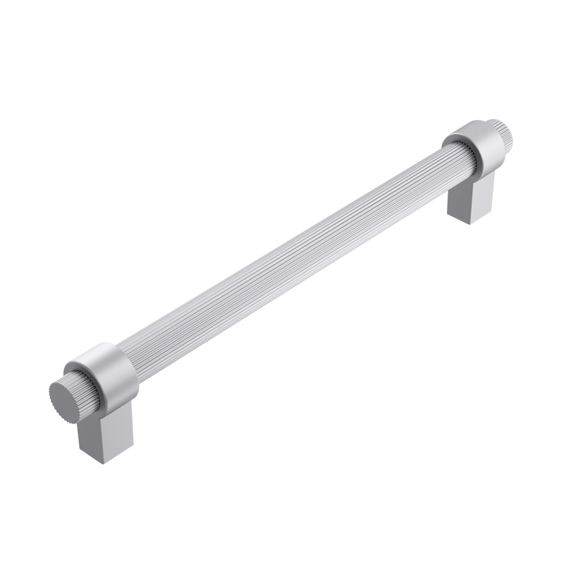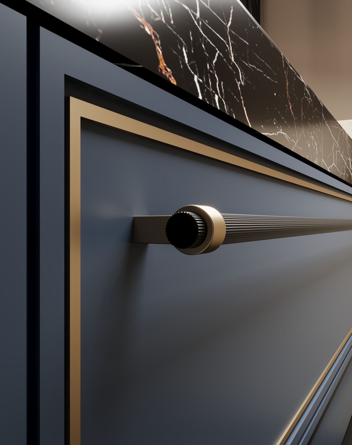 Минималистичный дизайн с рифлёной цилиндрической формой и графичной геометрией подойдёт как для лаконичных, так и для более декоративных фасадов. Ручка эффектно подчёркивает линии мебели, добавляя глубину и динамику за счёт продольного рельефа.