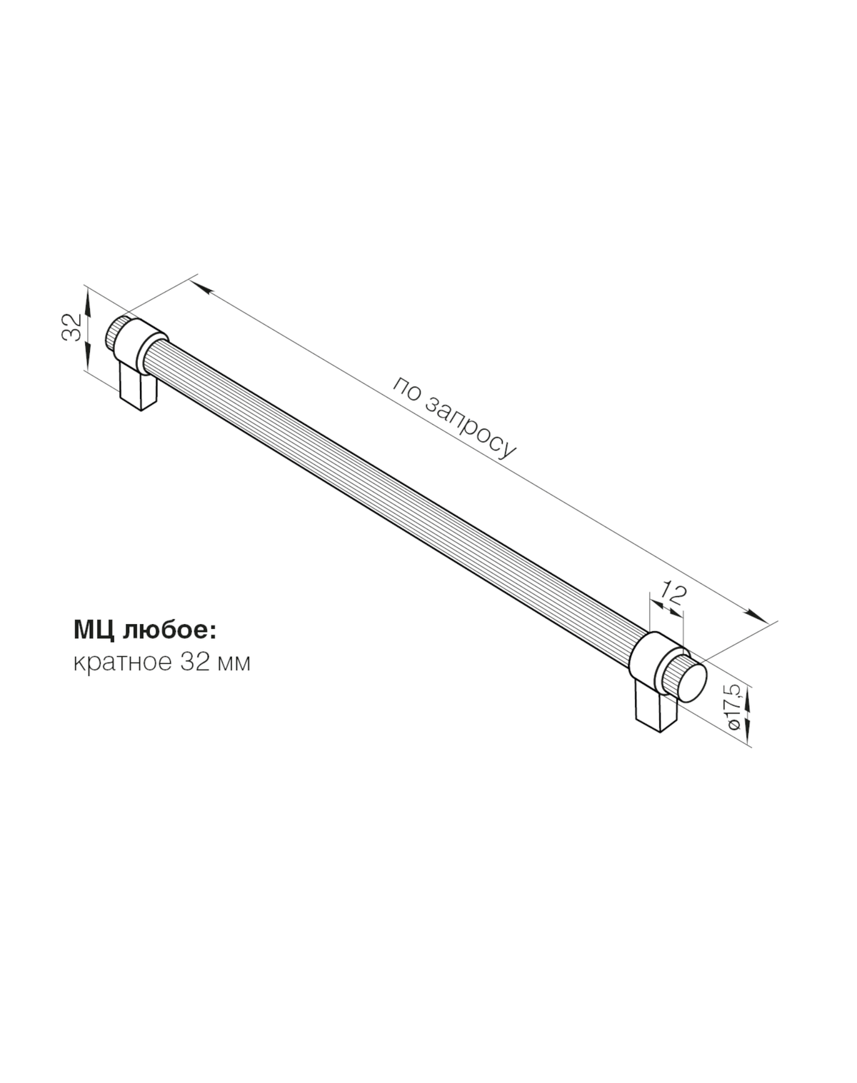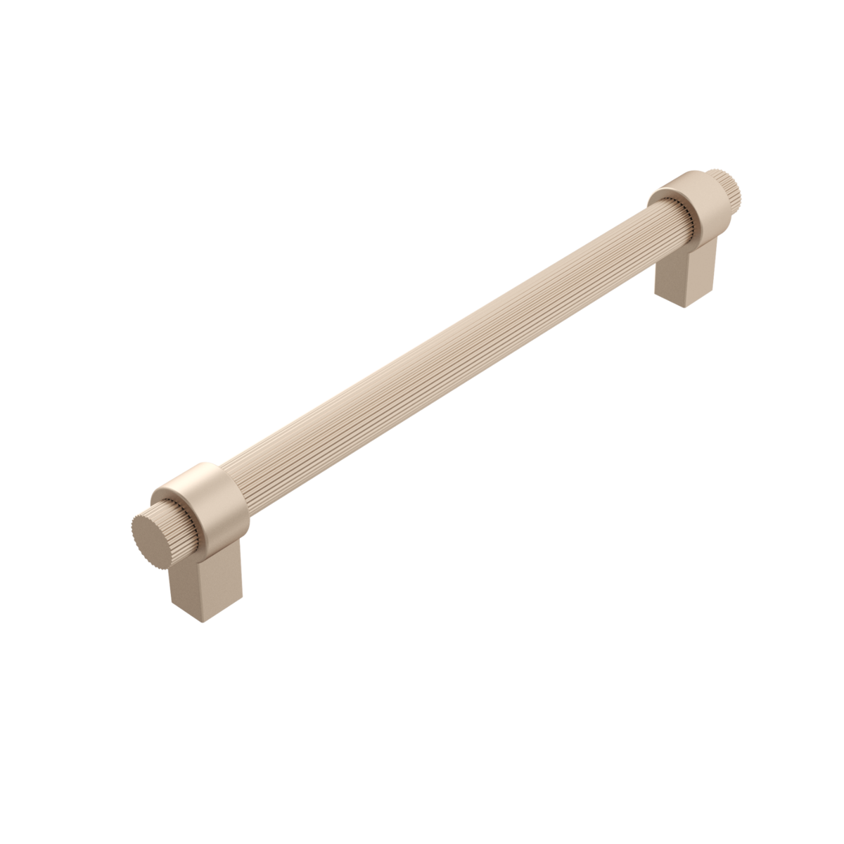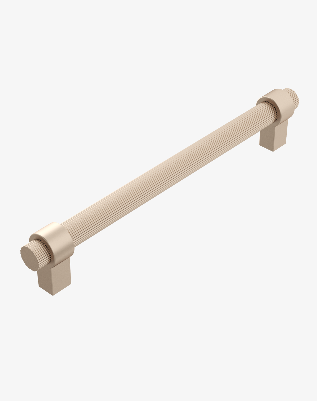 Минималистичный дизайн с рифлёной цилиндрической формой и графичной геометрией подойдёт как для лаконичных, так и для более декоративных фасадов. Ручка эффектно подчёркивает линии мебели, добавляя глубину и динамику за счёт продольного рельефа.