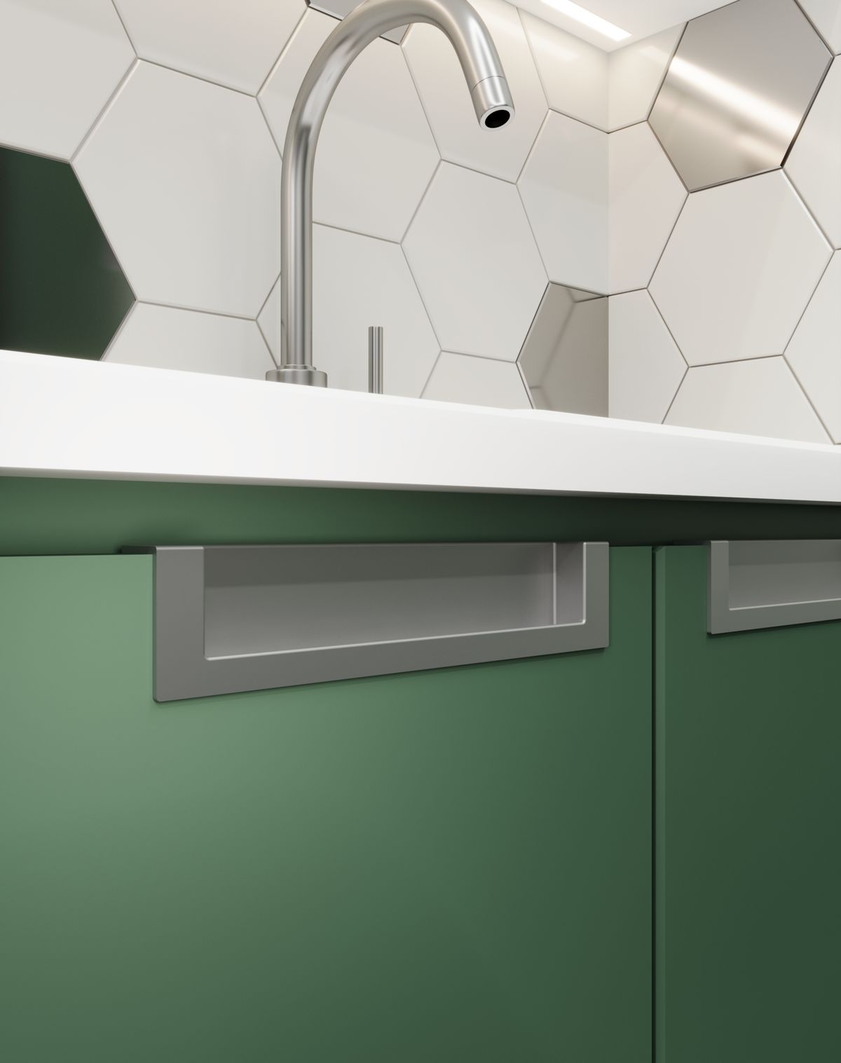 Ручка 143 идеально вписывается в фасад, создавая эффект встроенного элемента и сохраняя чистую геометрию мебели. Благодаря минималистичной форме и особенностям установки, она выглядит аккуратно и стильно — особенно в сочетании с гладкими матовыми или насыщенными цветными фасадами.