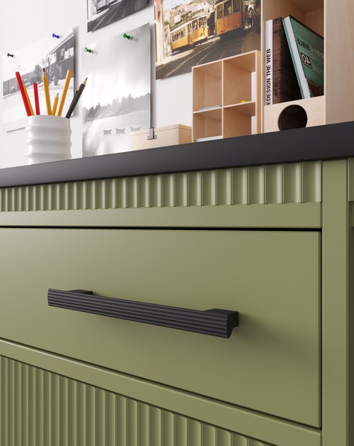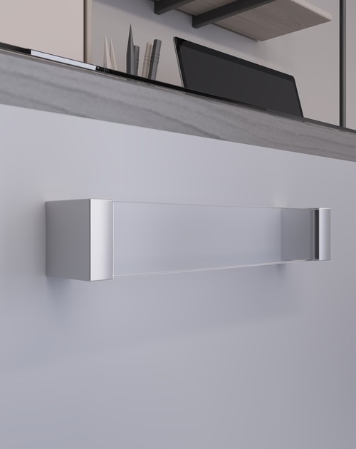 Благодаря межцентровому расстоянию 160 мм ручка визуально вытягивает фасады, придавая мебели элегантность и динамику.
